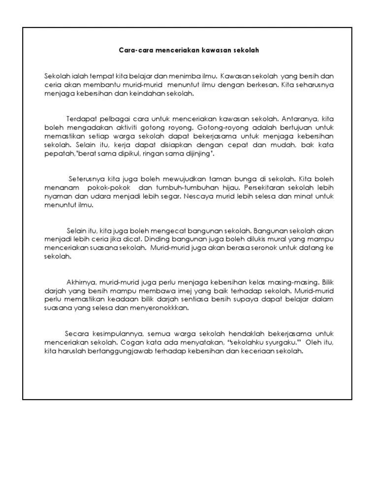 Setiap penghuni sekolah termasuk pelajar, guru dan kakitangan mesti menjaga kebersihan dan keindahan sekolah. Bapa dan guru dapat bekerja sama untuk menceriakan sekolah. Kepentingan menjaga kebersihan kawasan sekolah. Sebagai pelajar, kita seharusnya menjaga kebersihan dan keindahan sekolah. Setiap pelajar akan berasa selesa . Menjaga kebersihan dan keceriaan sekolah merupakan satu perkara yang baik.